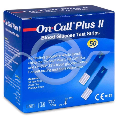 On Call Plus Tiras Reactivas Glucemia II 50 Unidades. Son tiras reactivas para medir la glucosa en sangre con los glucómetros de On Call Plus II, On Call Plus y On Call Plus Ez II. Vienen en un envase de 50 unidades. Los medidores de glucemia On Call Plus ofrecen la solución perfecta para cada paciente. Autoexamen y uso profesional. Ofrecen fiabilidad, máximo confort y una perfecta gestión de la diabetes.